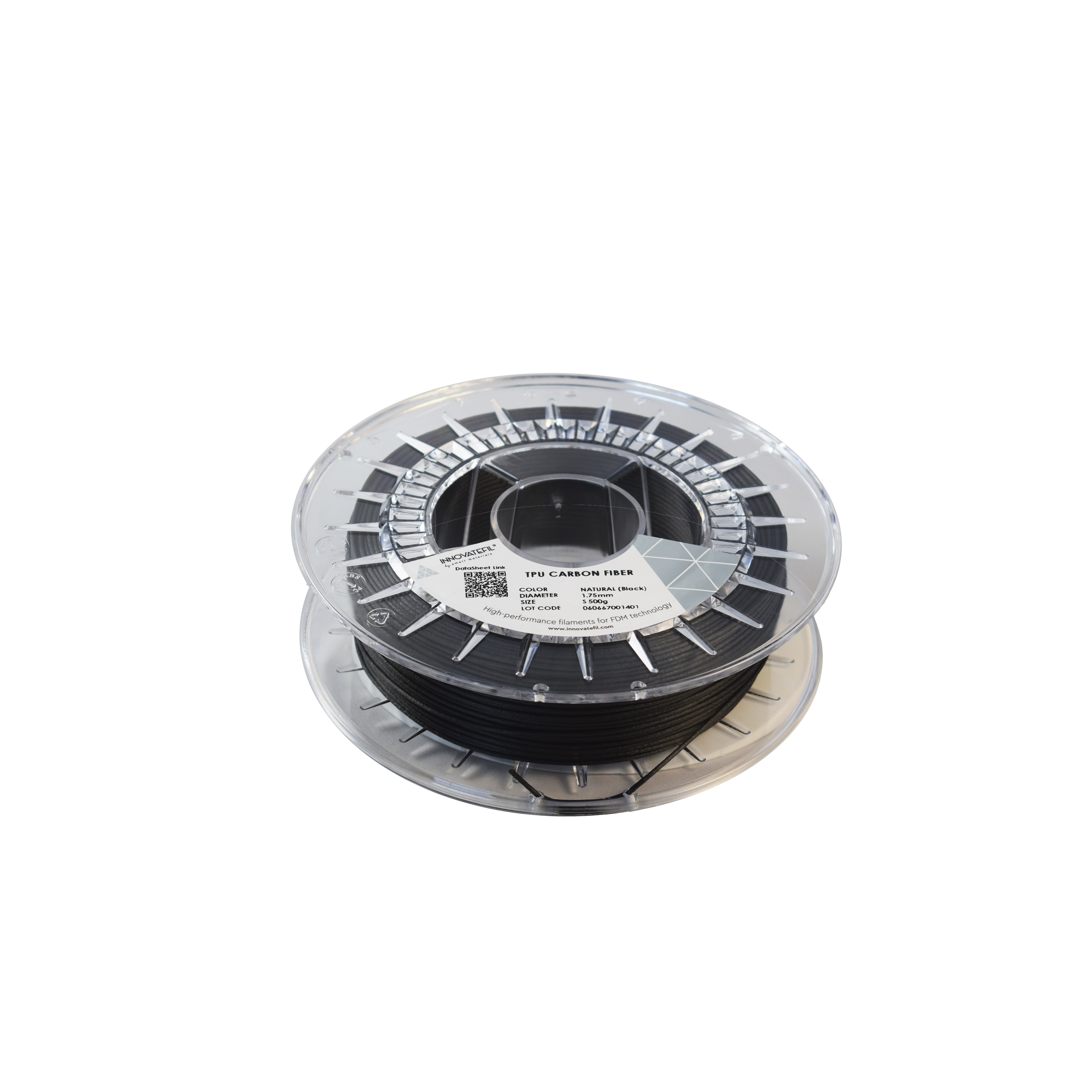 Carbon fiber reinforced elastomer thermoplastic. With this filament you can print flexible objects, with a high printing quality. The incorporation of carbon fibers offers improved properties, high tensile strength, high heat tolerance and greater chemical resistance compared to unreinforced TPUs.